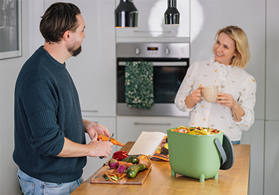 Ideal für die Küche – der 10-Liter-Kompostbehälter mit Holzkohlefilter ermöglicht es Ihnen, organische Abfälle geruchsfrei zu sammeln und diese in den Außenkomposter zu bringen.